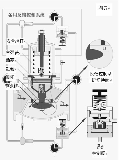 當P1上升時,減壓閥的P2+ΔP2首先表現為上升,其值通過反饋系統出口管傳到控制閥,使Pt′+ΔPt′,ΔPt′與Pk′的力達到新的平衡,控制閥h減小;相應ΔPk′壓力增大,經壓力導管,使主閥的Pk+ΔPk,Pt=Pk+ΔPk壓力達到新的平衡,主閥h減小、ΔP2值恢復為原P2值。當進口壓力P1下降時,主閥與控制閥的工況則與上述的工況相反。